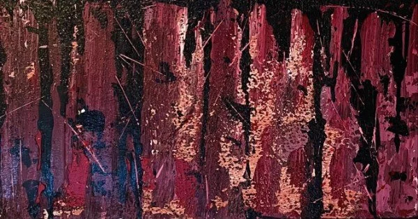 Against a backdrop of rich reds and blacks reminiscent of a dense redwood forest, the scene unfolds with breathtaking intensity. Each stroke of the palette knife captures the rugged beauty of the forest floor, where layers of ground gravel add an earthy realism to the composition.