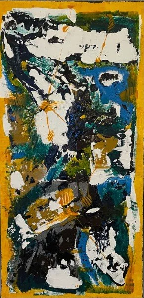 A 12x24-inch abstract marvel, transforms the canvas into a dynamic exploration of color and form. Framed by a bold yellow border, the artwork captures the essence of movement and spontaneity. Within the abstract landscape, swipes of white, blue, grey, and black dance across the canvas, creating a visual symphony of contrasts.