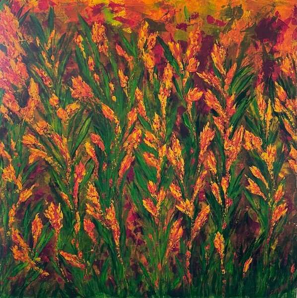 Immerse yourself in the intricate details of the grasses, illuminated by the play of metallics that add a touch of brilliance. The 21x27" frame elevates the presentation, making it a ready-to-display piece that effortlessly becomes a conversation starter in any space. Secure this framed original to make it a cherished part of your collection.