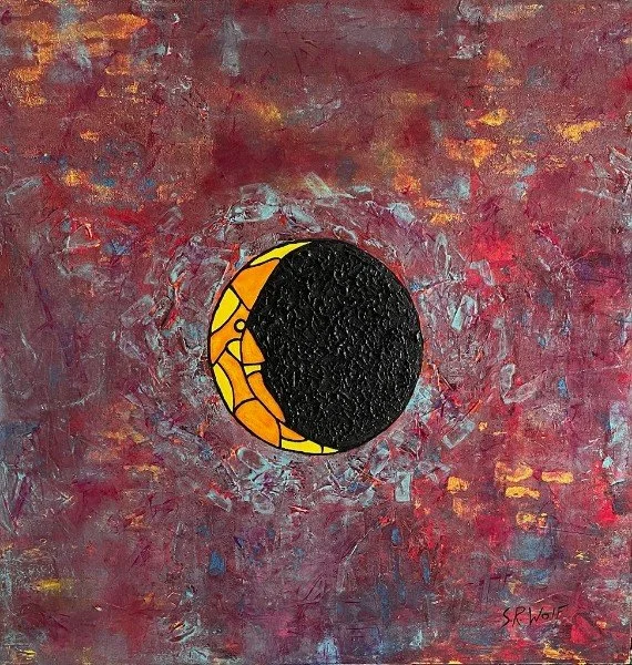 An invitation to the realm of cosmic introspection. At 36x36 inches, this acrylic masterpiece blends sand and metallic accents on canvas to conjure a mesmerizing scene. A black circle, bold and enigmatic, dominates the composition, reminiscent of the vastness of the universe. Within its depths, a yellow geometric moon hangs suspended, radiating celestial allure.